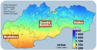 Ročná hodnota globálneho žiarenia na Slovensku v kWh/m2